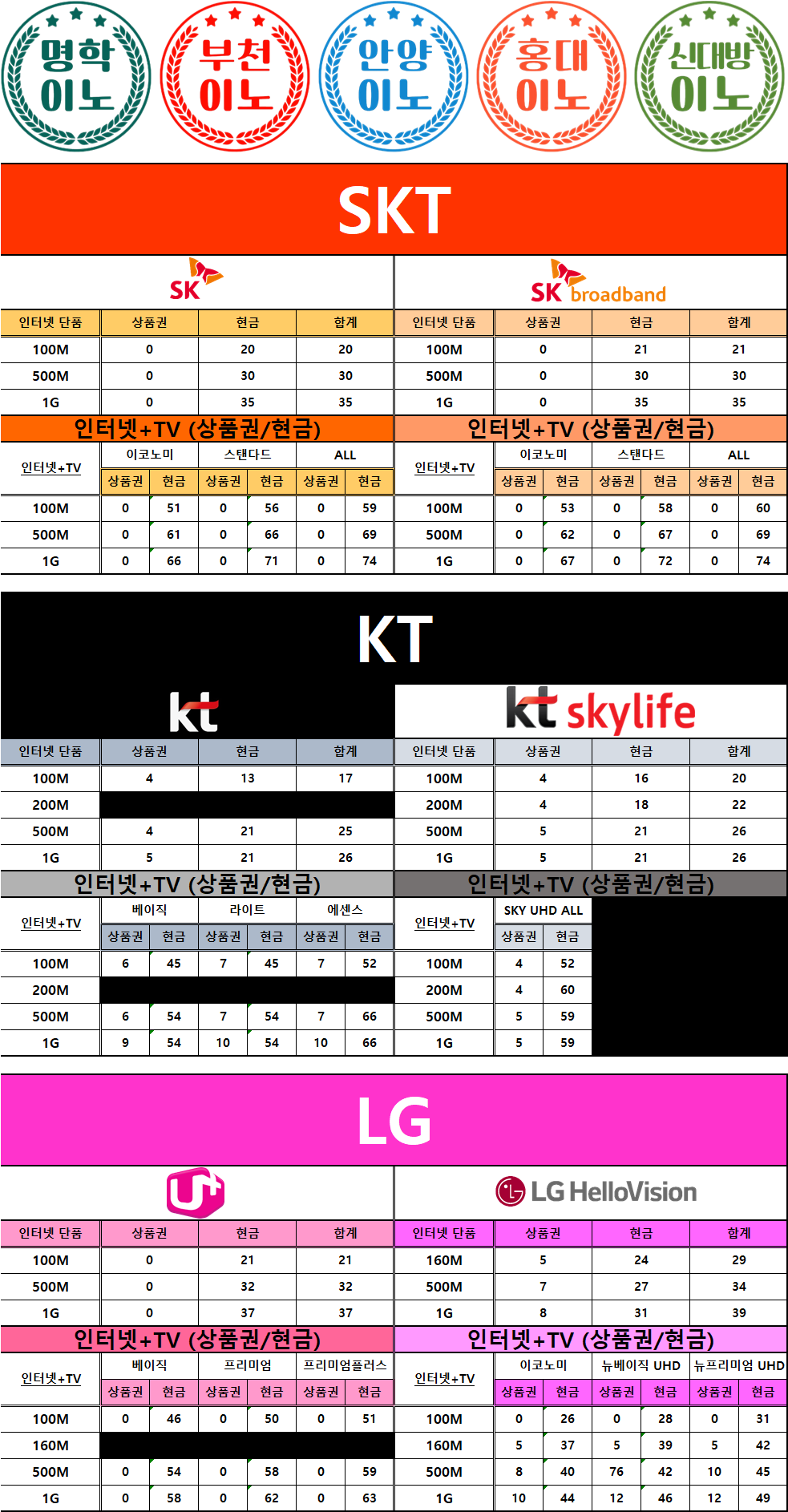 💡 통신사별 인터넷가입 현금지원 시세표 (2024.05 기준)